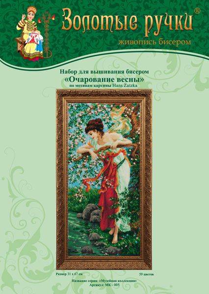 В набор входит: канва Aida №14 Zweigart (без нанесенного рисунка), бисер (Чехия), бисерная игла, гобеленовая игла, лента, схема для вышивания, инструкция по вышиванию. Полная зашивка бисером.