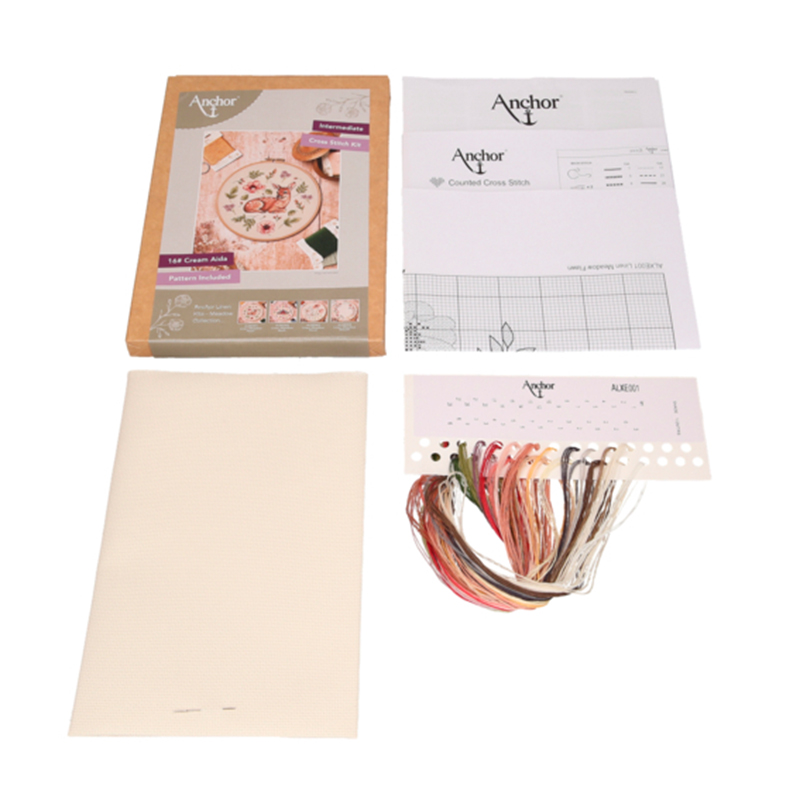 В набор входит: канва Aida 16 цвет бежевый, схема черно-белая, нитки Anchor 100% лен, игла, инструкция.