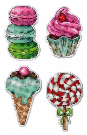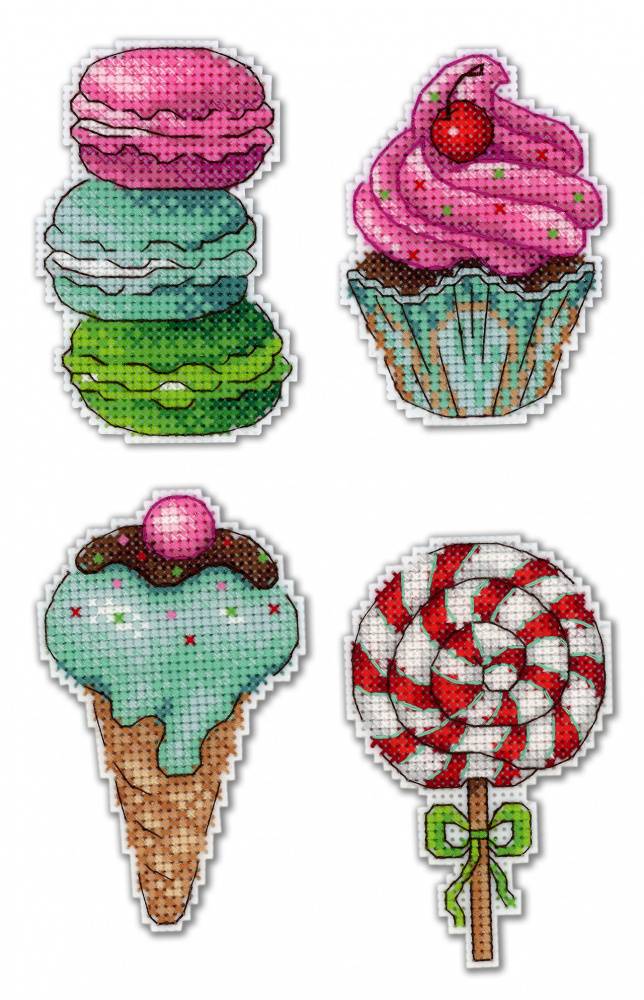 В наборе - пластиковая канва, нитки мулине 22 цвета, фетр белого цвета. магниты 4 шт., схема для четырех сюжетов и руководство по вышиванию.