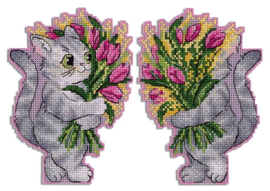 В наборе - сиреневая пластиковая канва 14 каунта, нитки мулине ПНК им.Кирова 15 цветов, разобранные на органайзере, игла, схема и руководство по вышиванию.