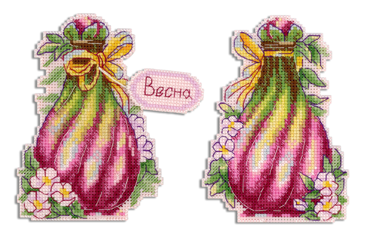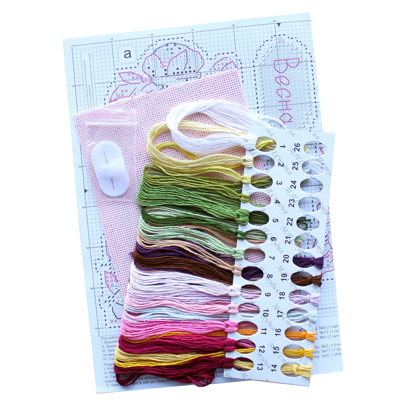 В наборе - розовая пластиковая канва 14 каунта, нитки мулине ПНК им.Кирова 20 цветов, разобранные на органайзере, игла, схема и руководство по вышиванию.