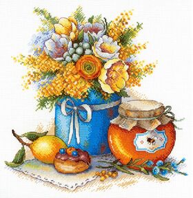 В наборе -канва Аида № 16 Gamma белая, нитки мулине Gamma 38 цветов, игла, цвето-символьная схема и руководство по вышиванию