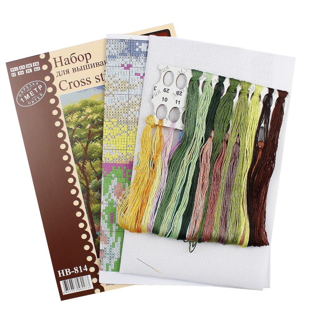 В наборе - канва Аида № 16, нитки мулине Гамма 27 цв., разобранные на органайзере, игла, цвето-символьная схема и руководство по вышиванию.