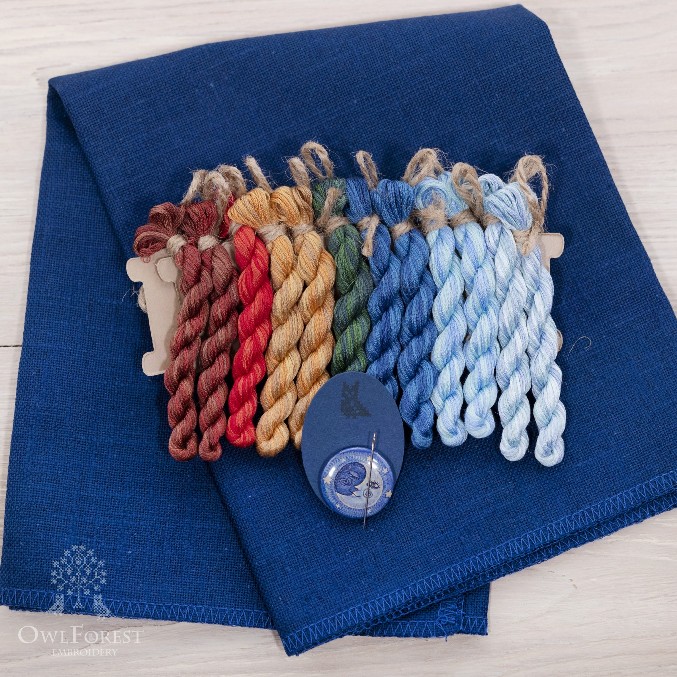 В наборе: основа равномерного переплетения ?belh?r Eva, 28 ct (100% лён), хлопковое мулине ручного окрашиваниямулине DMC ручного окрашивания (7 цв.), цветная символьная схема, игла для вышивания № 26 Prym, магнитный держатель схемы и иглы.