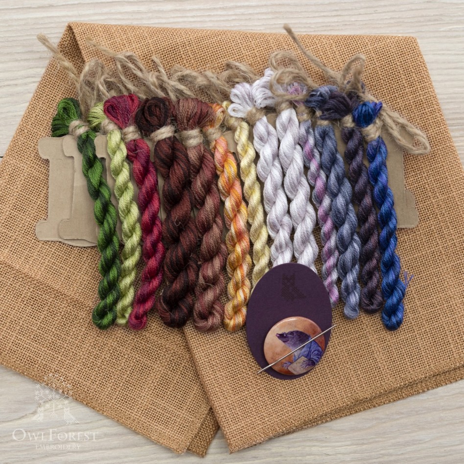 В наборе: основа равномерного переплетения, хлопковое мулине ручного окрашиваниямулине DMC ручного окрашивания (12 цв.), цветная символьная схема, игла для вышивания № 26 Prym, магнитный держатель схемы и иглы.