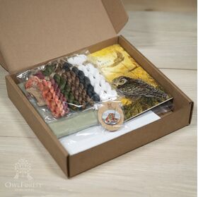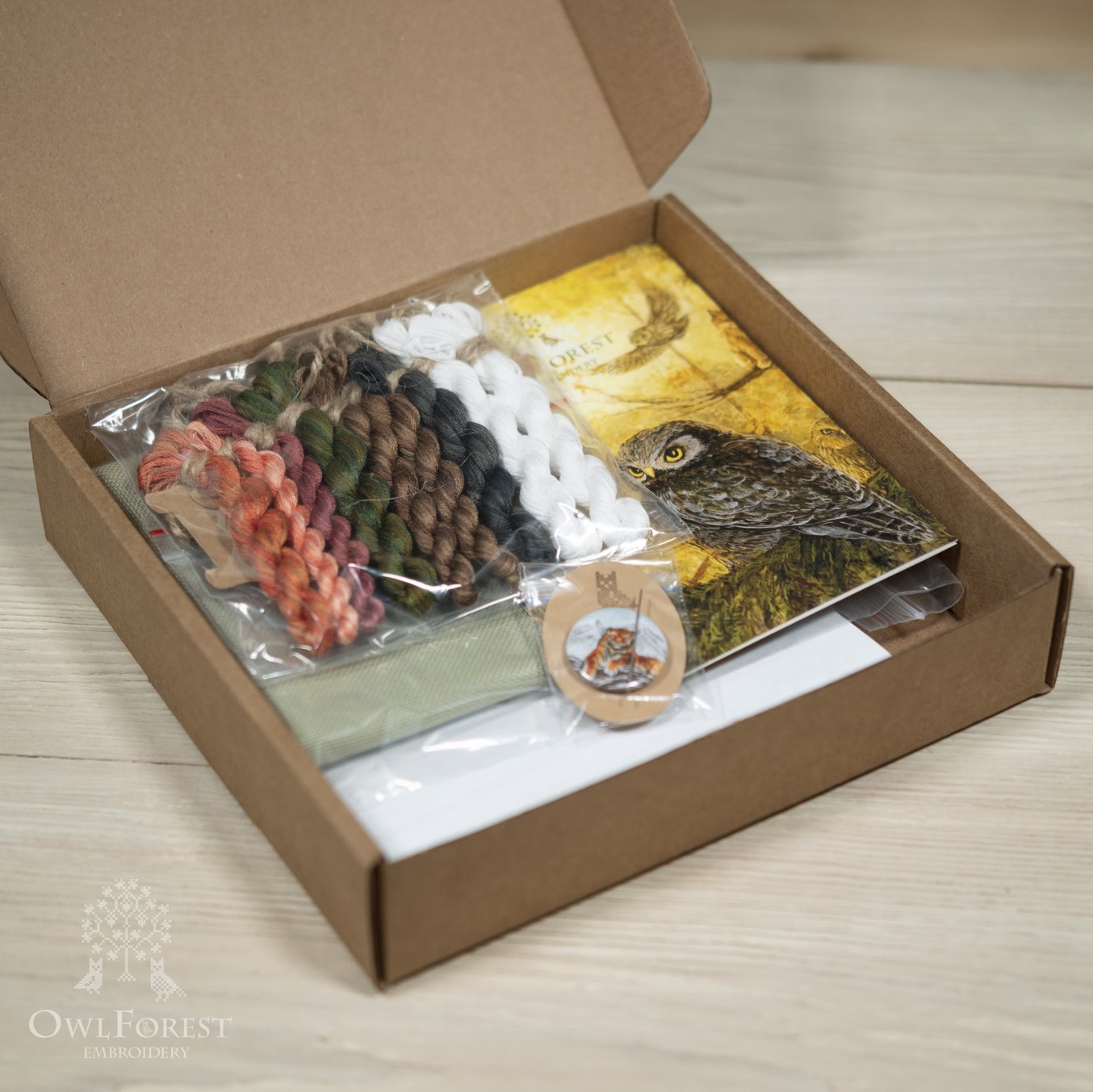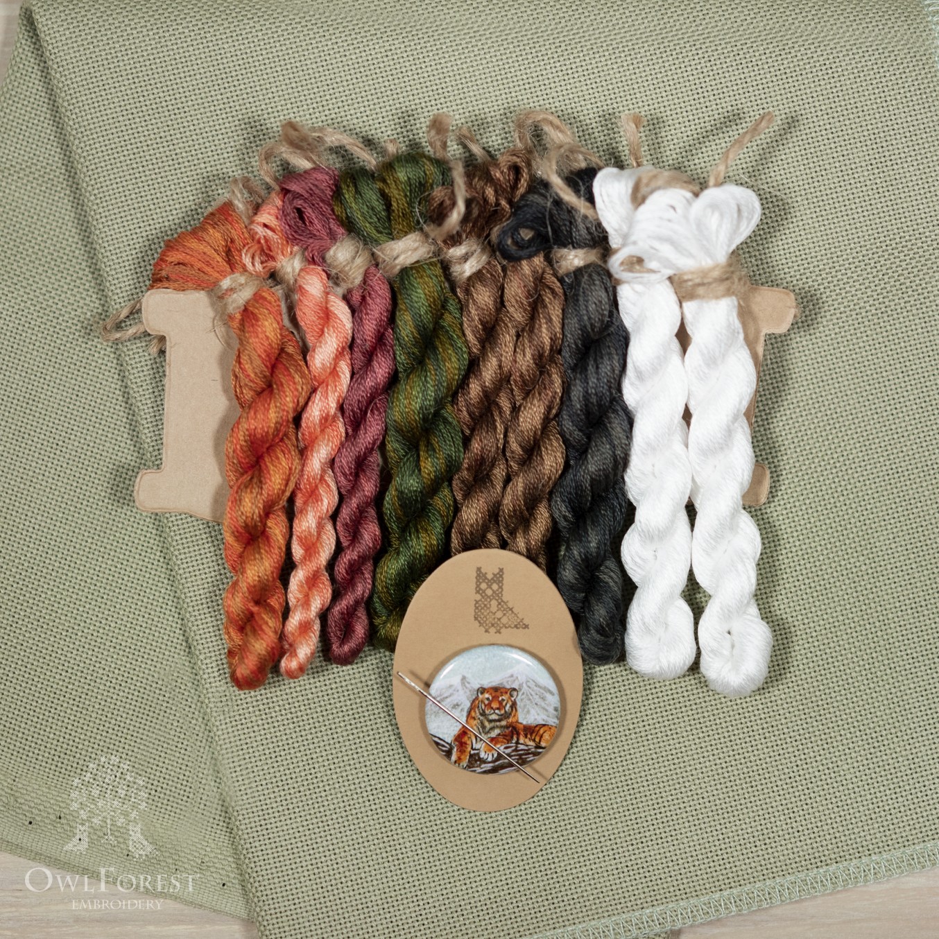 В наборе: основа равномерного переплетения, мулине DMC ручного окрашивания (7 цв.), цветная символьная схема, игла для вышивания № 24 Prym, магнитный держатель схемы и иглы.