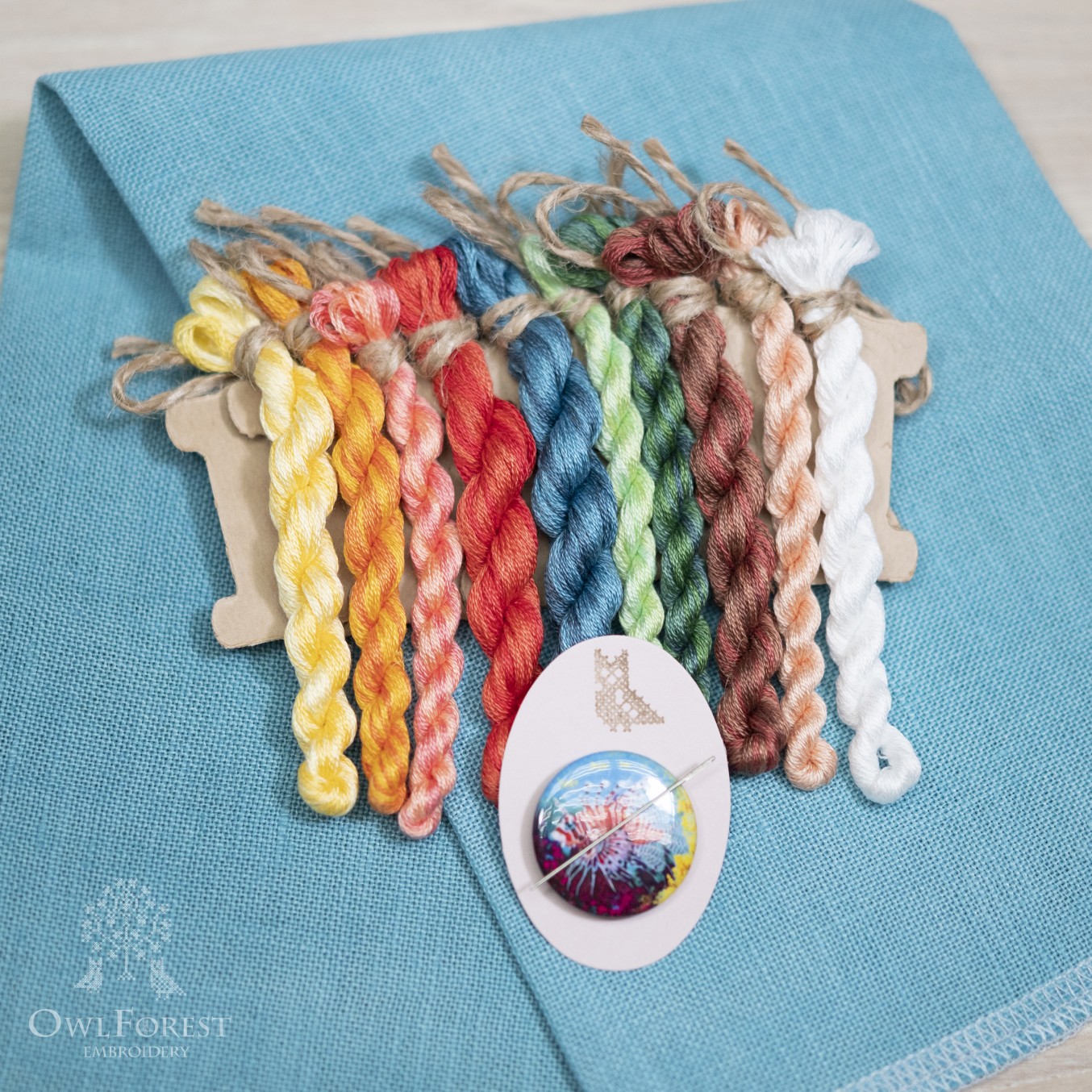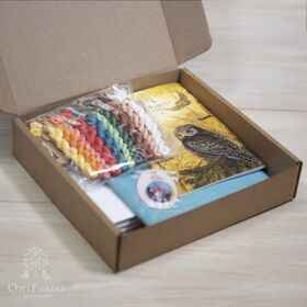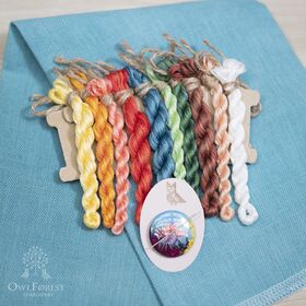 В наборе: основа равномерного переплетения ручного окрашивания Owl Forest 32 ct, 100% лён, мулине DMC ручного окрашивания (10 цв.), цветная символьная схема, игла для вышивания № 24 Prym, магнитный держатель схемы и иглы.