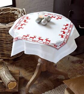 Содержимое набора: Скатерть белая с обработанным краем и нанесёнными крестиками, хлопковые мулине DMC, игла, схема.