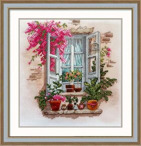 В наборе: канва № 18 Aida Gamma с дизайнерским принтом от Zolotie ruchky (Россия), мулине Gamma 34 цв. (Россия), металлизированная нить (серебристая), ювелирный бисер, крупный бисер, декоративные пуговички ручной работы производства Zolotie ruchky в виде горшочков для цветов, серебристая подвеска в виде птички в клетке, игла для ниток, игла для ювелирного бисера, крупная схема для вышивания с цветным back stitch, QR-код для скачивания электронной схемы в формате SAGA.