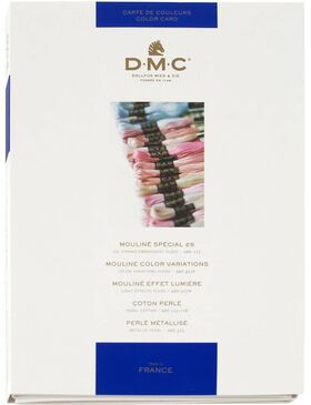 Карта цветов DMC с образцами всей палитры мулине (489 оттенков), а также образцами металлизированных нитей, значительно упрощает подбор мулине других производителей, ведь ни для кого не секрет, что почти 80% схем имеют номера DMC.